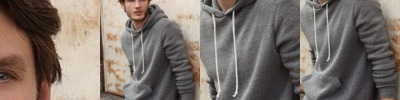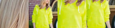 - Raw-edge seams on raglan shoulders, side gusset panels, pocket and waistband