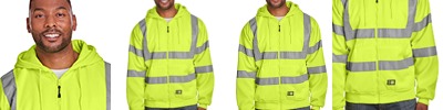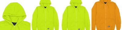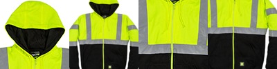 9 oz., Blended Fleece; Medium-weight fleece lined; Ansi class 3 certified; 2" reflective tape; Double-layered three-piece hood; Oversized front pockets; Knit cuffs and waistband; Nylon front zipper;