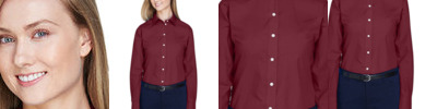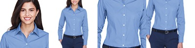 3.4 oz., 55% cotton, 45% polyester; Fine yarn count shirting; True Non-iron performance straight from the dryer; Patented pucker-free taped seams; Fused collar cuffs and placket; Split back seam with bias cut back yoke; pearlized buttons; straight collar; front and back princess seams for a flattering feminine fit; bust darts for a flattering feminine fit.