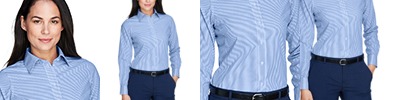 4.1 oz., 60% cotton, 40% polyester; fine yarn count shirting; true Non-iron performance straight from the dryer; patented pucker-free seams; specially fused collar, cuffs and placket; split back seam with bias cut back yoke; pearlized buttons; straight collar; front and back princess seams for flattering feminine fit; bust darts for a flattering feminine fit.