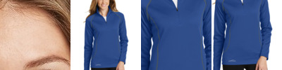 Smooth-faced fleece with a subtle grey print gives this 1/2-zip a sleek performance look. Reverse coil zipper, open cuffs and an open hem. Princess seams, welded zippered left sleeve pocket, contrast Eddie Bauer heat transfer logo on right hem. Made of 7.7-ounce, 95/5 poly/spandex.