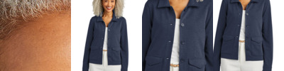A structured double-knit style with a luxuriously soft hand, this versatile woman's jacket adds a touch of utilitarian flair with a full button-front closure. The jacket can be cinched with a hidden waist drawcord for a more form-fitting look.
